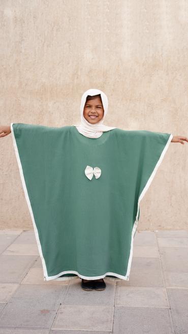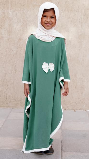 Dark Green and Off White Kids Kaftan with a Bow and Band Work