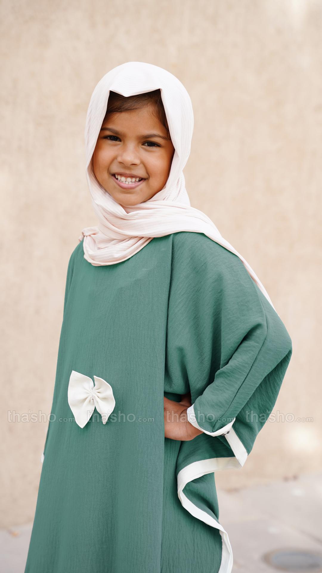 Dark Green and Off White Kids Kaftan with a Bow and Band Work